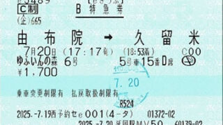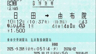 天ケ瀬から博多までの特急券です。福岡・大分ごほうびきっぷを使用しているため、指のみ券となっています。以前は天ヶ瀬駅では駅員がいてE-POS端末による指定席の発行が可能でしたが、現在は無人駅となっており...