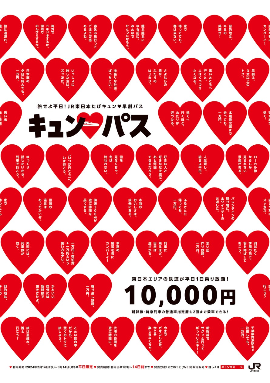 JR東日本と一部の第三セクターが2/14~3/14の平日の間、1日乗り放題の「旅せよ平日!JR東日本たびキュン早割パス」です。