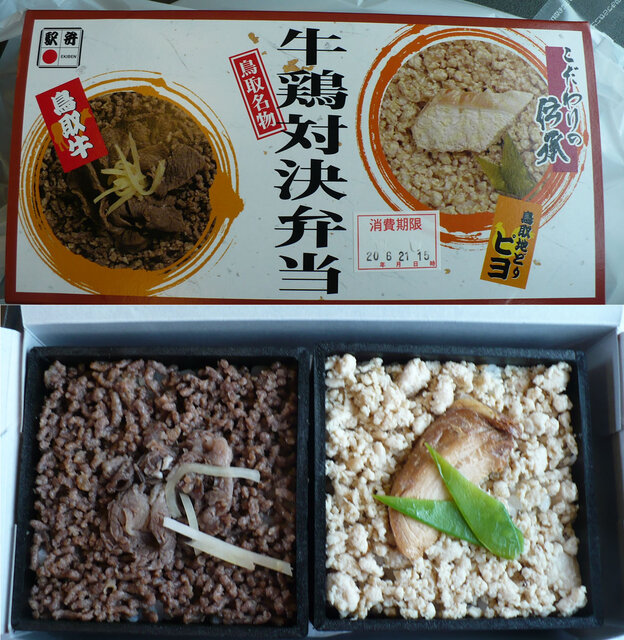 鳥取駅で購入したアベ鳥取堂の駅弁「牛鶏対決弁当」980円也。鶏そぼろと牛そぼろをびっしり敷き詰めたある意味かなり振り切った感じの弁当。でも鳥取地どりピヨってなんなんだろう。そんなブランド聞いたことないんだけど。