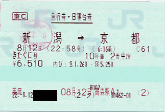 新潟から京都の急行「きたぐに」のB寝台券です。
