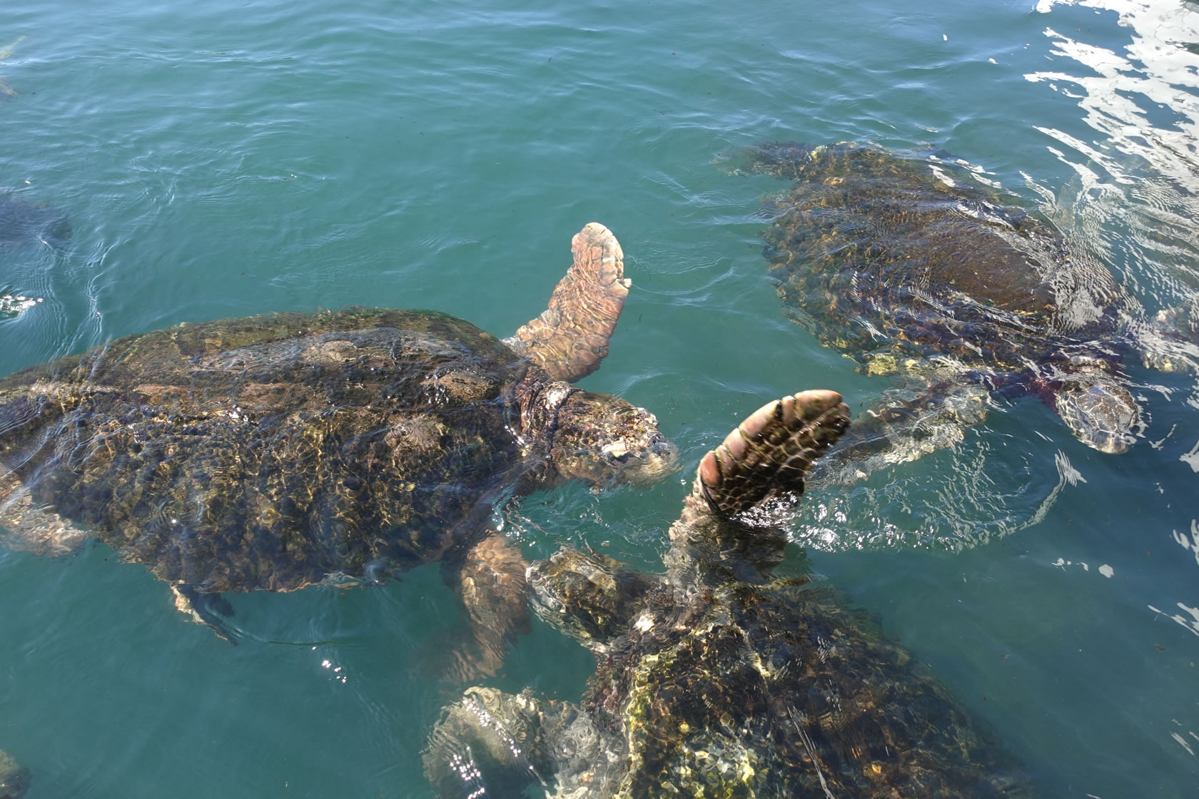 ウミガメの餌やり。餌は200円。餌を投げ入れるとウミガメが鯉のごとくすすす~と近寄ってきて、場合によってはカメ同士で奪い合いになることも(笑)