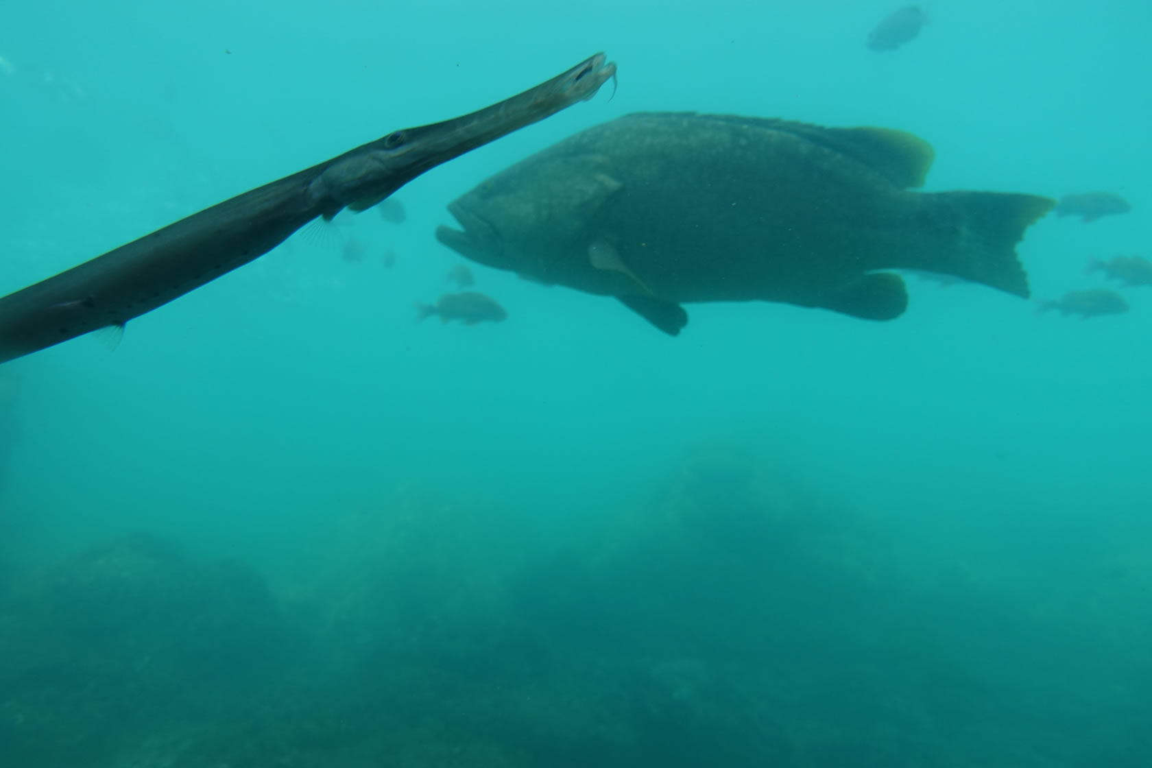 入って海の中を見ると、明らかに1.2mは超えるクエと思しき魚が悠々と泳いでいます。こんな大物が目の前を泳いでいるのはちょっとびっくり。