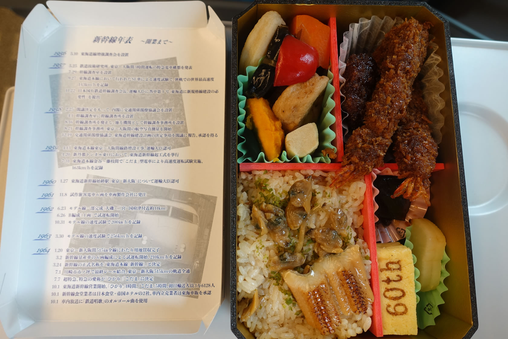 60thの焼き印の入った卵焼き、えびふらい、それに深川めしが目につきますが、あなごに味噌カツ、煮物が詰め込まれています。