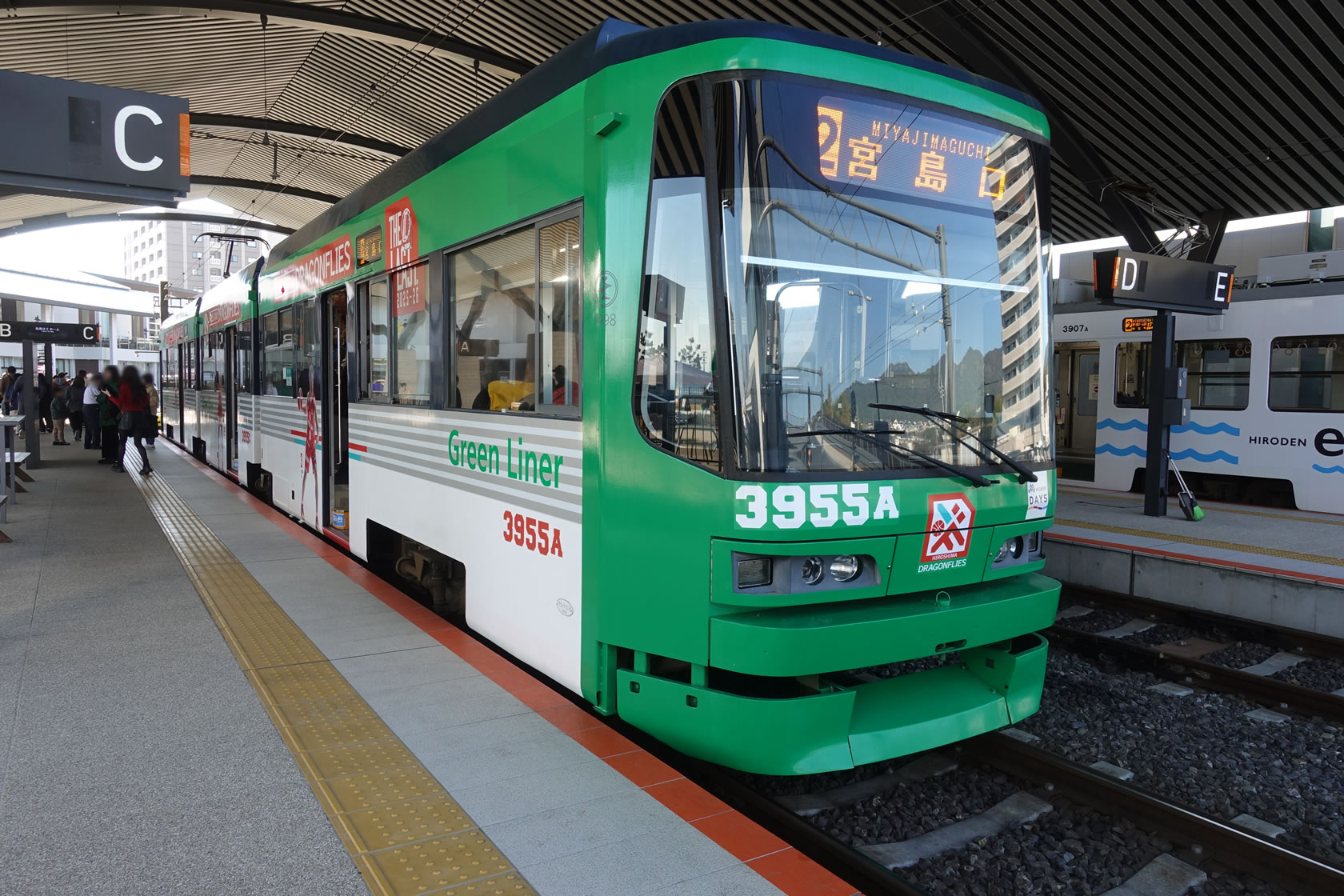 広電というと3両編成や5両編成の連接車両の路面電車が闊歩するイメージがありますがこの長編成の列車は、広島駅~宇品の1号系統、もしくは広島駅~宮島口の2号系統に主に起用され、特に2号系統はほぼ全列車連接車です。