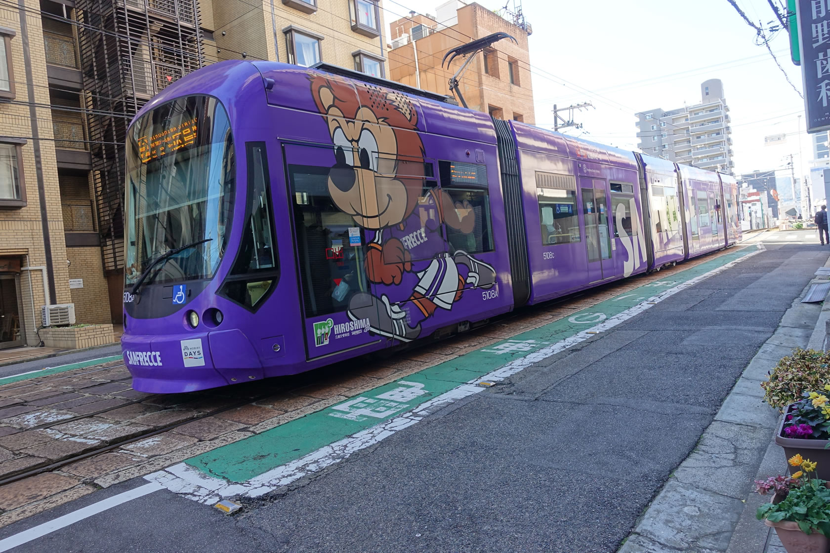 帰り宮島口駅で待っていたのはサッカーチームのサンフレッチェ広島のラッピング車両。車体にサンチェくんが大きく描かれたド派手な車両で、車内放送はもちろんサンフレッチェ広島の選手が担当。