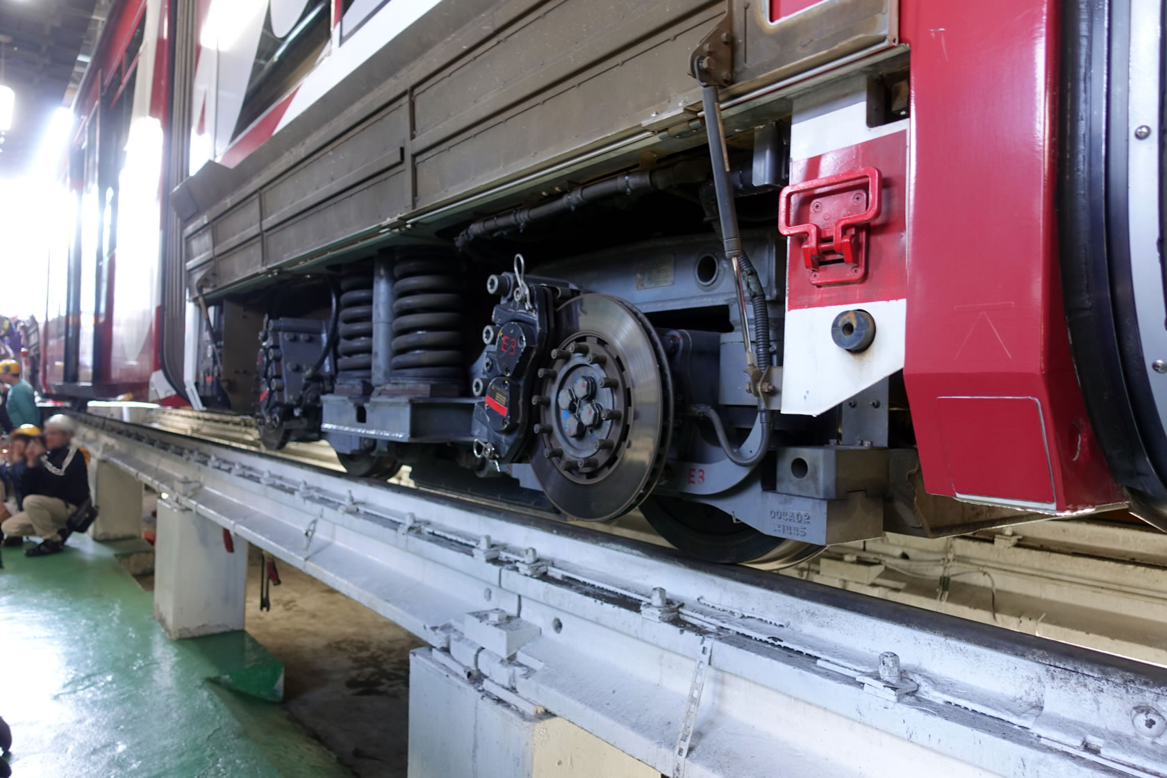 そのカープ電車の台車部。低床車ということでかなりコンパクトにまとめられています。そして2両目と4両目が浮いている様子もよくわかります。