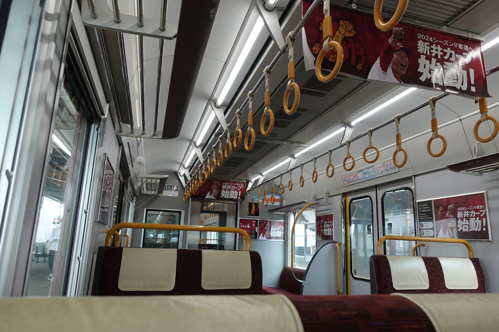 車内は広告欄はすべてカープ一色。新井カープですが、2024年はこの時点では好調で8月までセリーグ首位を堅持。しかし9月に5勝20敗と歴史的な失速で首位どころかクライマックスシリーズ進出まで逃してしまいました。