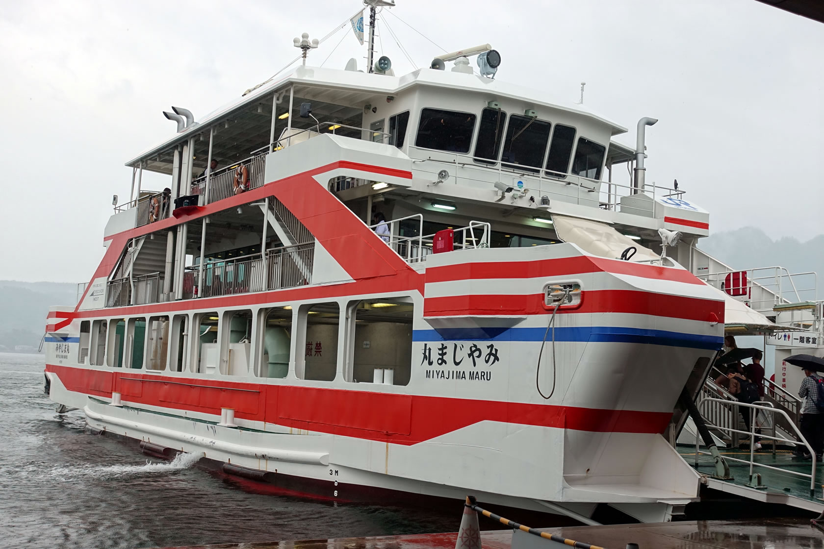 一番手はJR西日本宮島フェリーの「みやじま丸」。日本初のディーゼルエンジンではないモーターを回してスクリューを回転するフェリーとして知られています。