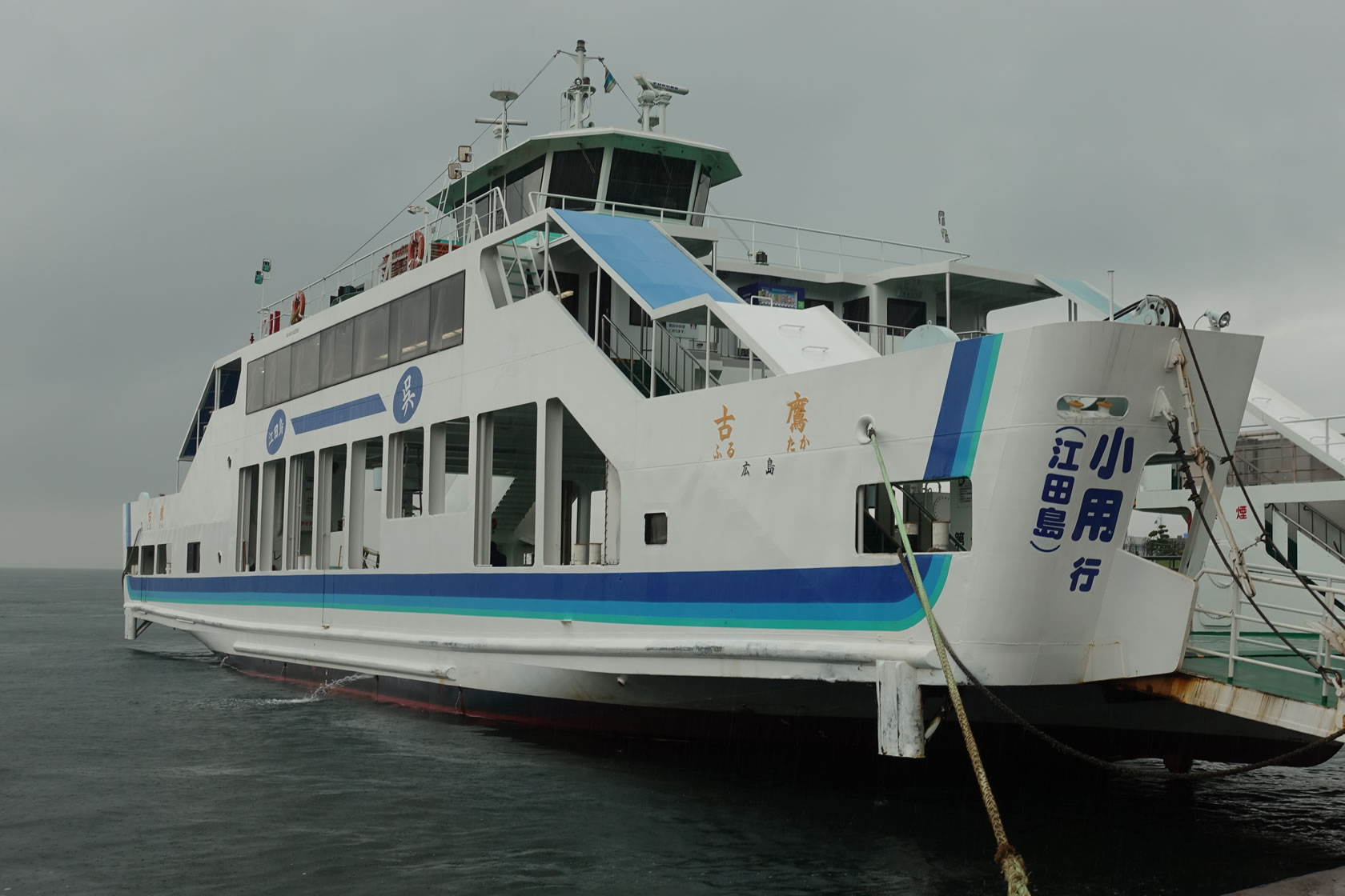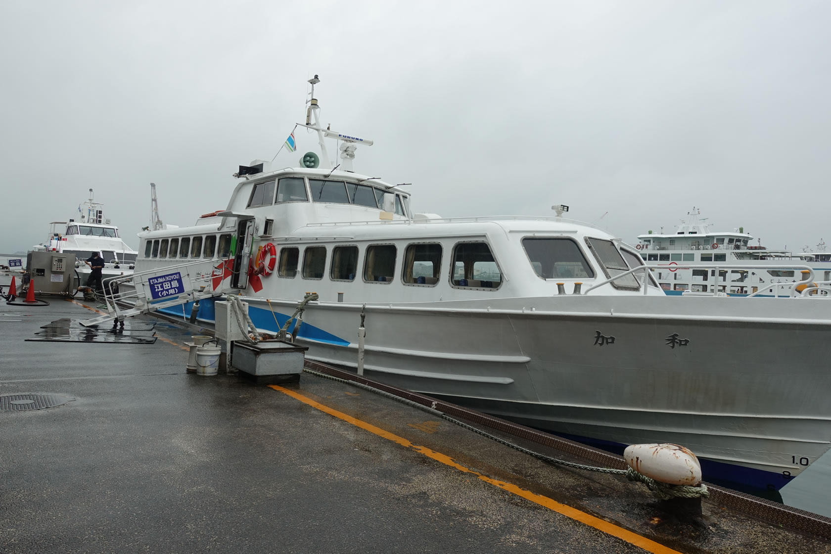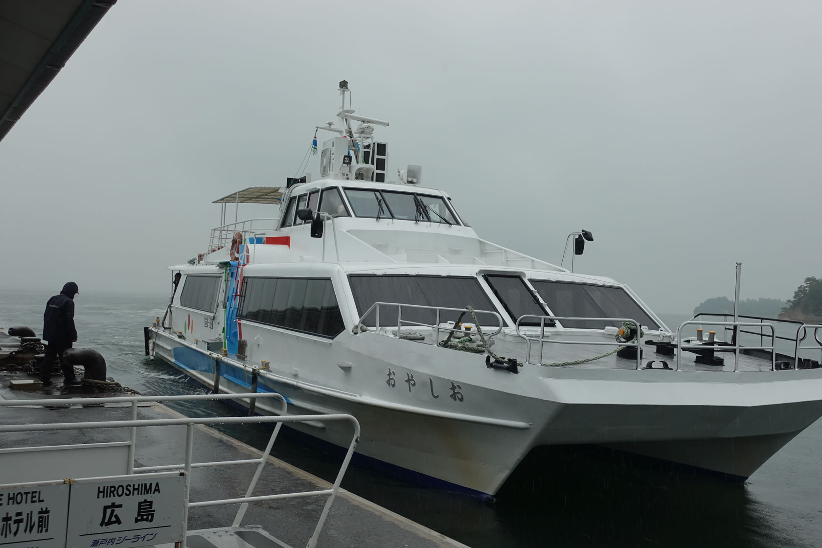 シーズンには大行列ができる航路ですが、この日は悪天候ということもあってほとんど客はいません。やってきた「おやしお」は乗り降りを済ませるとすぐに折り返して広島へ。