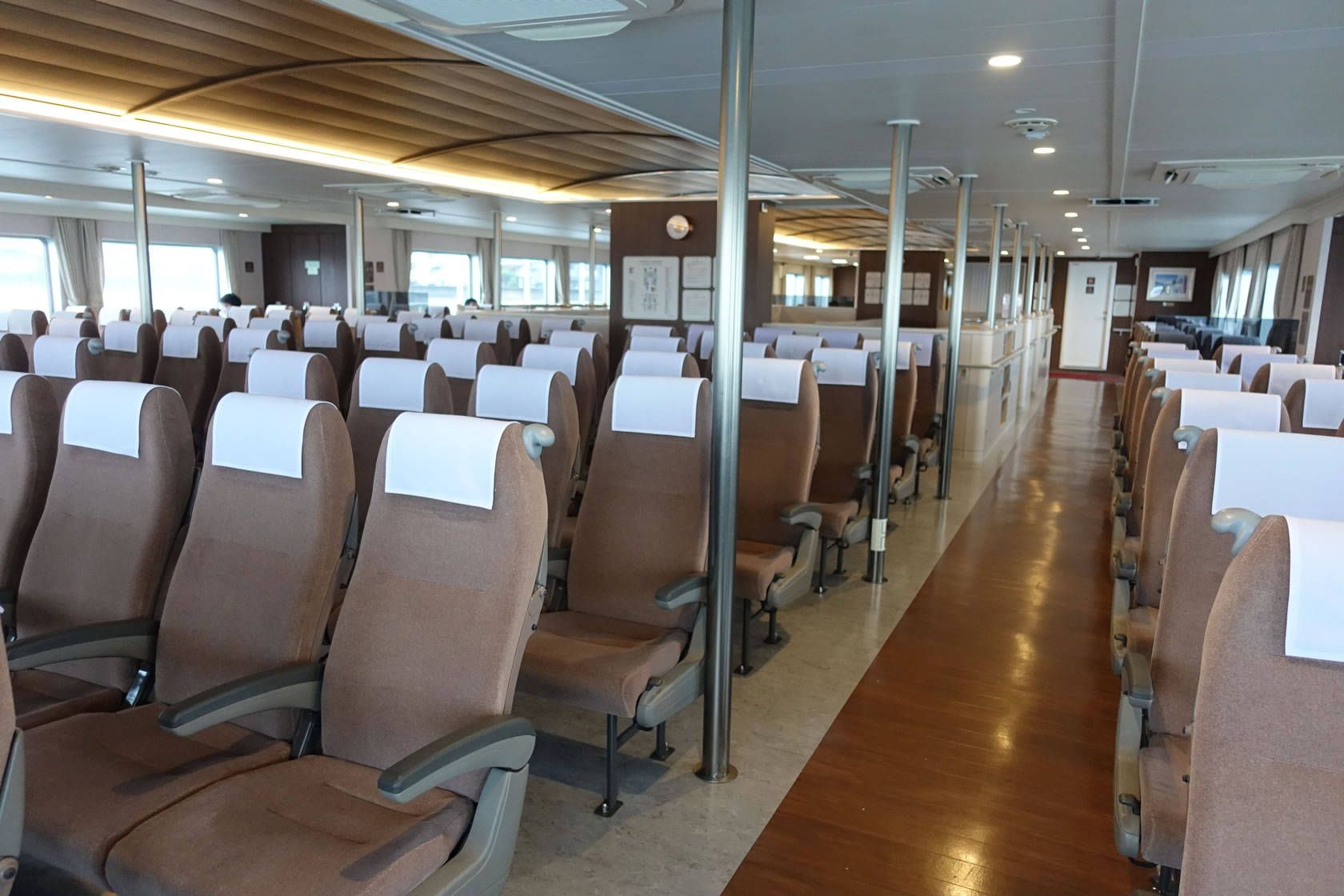 当然ながら船内も広く、客層もバラエティ豊か。インバウンドの姿も見えます。船内はリクライニングシートと桟敷席と、一般的なフェリーとほぼ同等です。