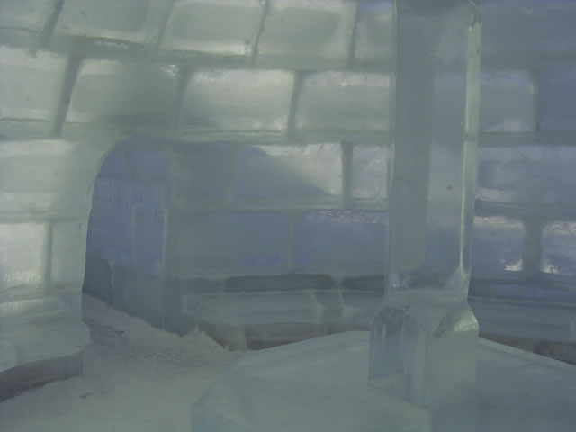 氷を住み上げた家。日の光が複雑に照らします。座ると冷たい(笑)