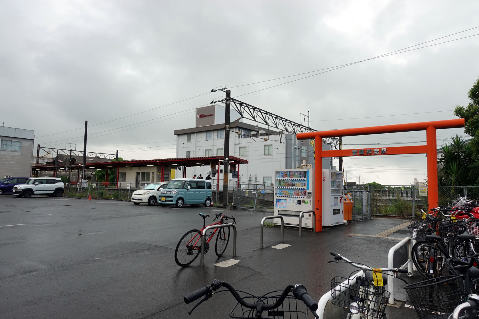 ホテルを出てまず最初は宮崎神宮から。これは宮崎神宮から徒歩10分ほど。25年ほど前にも訪問したことがあり、そのときは朱塗りの赤い駅舎が印象的だったのですが・・・