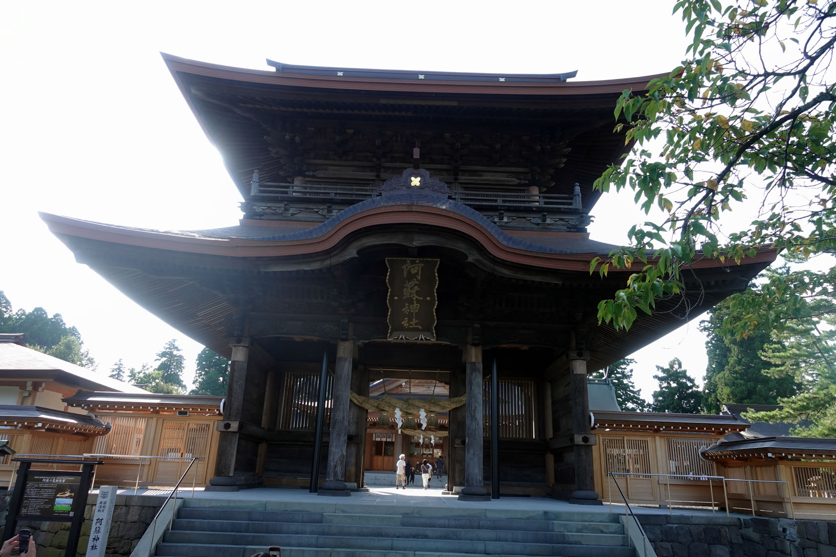 玉来から乗車した普通列車は定刻の15:46に宮地駅に到着。宮地駅を出て正面を約15分ほど歩くと阿蘇神社の楼門が左手に見えてきます。