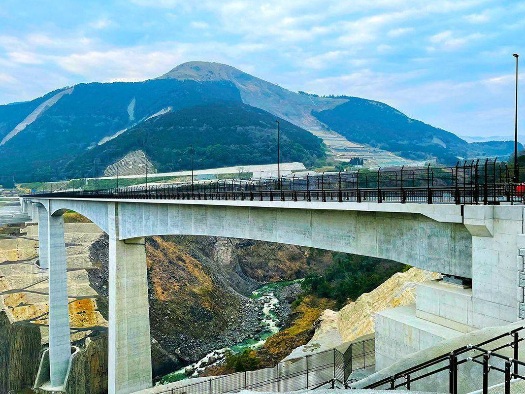 一方で地震以降に建てられた新阿蘇大橋も。こちらは地震に強い橋として架橋されたそうですが、結構高いところを走ってます。