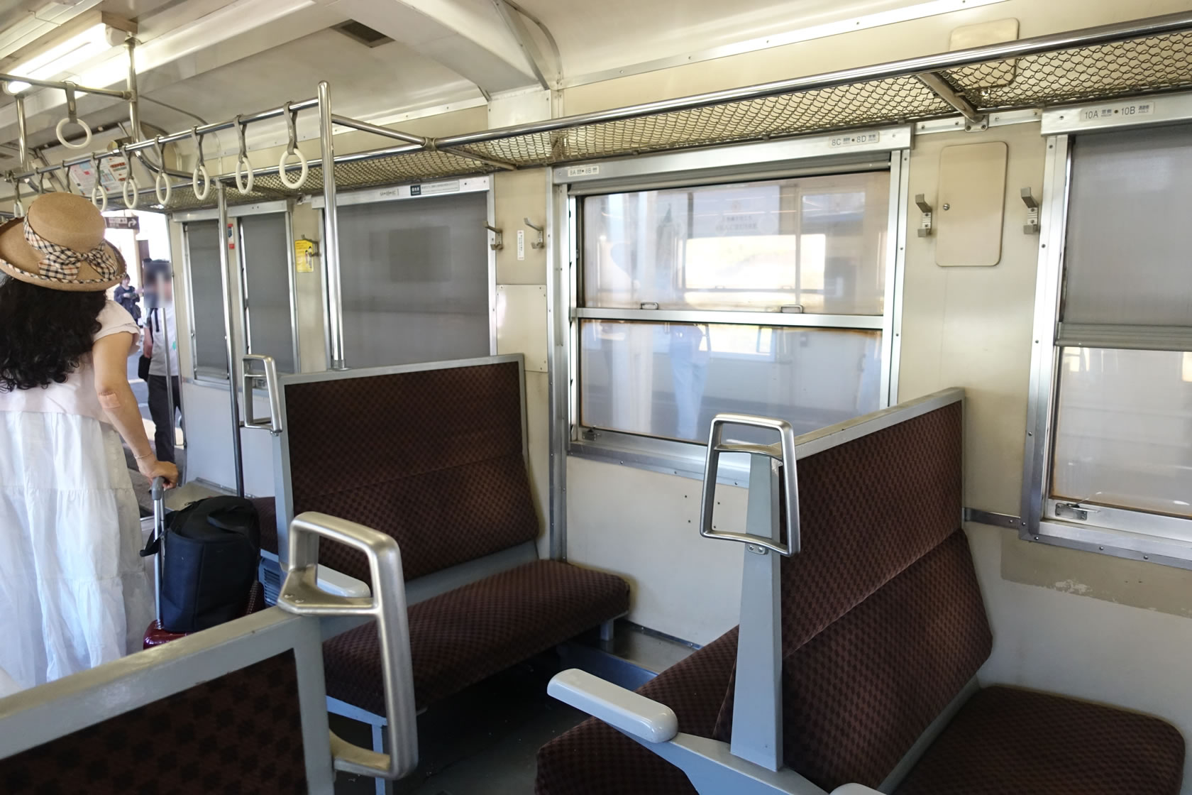 車内はJR九州お得意の一部座席を撤去した座席減車。もっとも一定数のボックスシートが残されており、全員が着席。