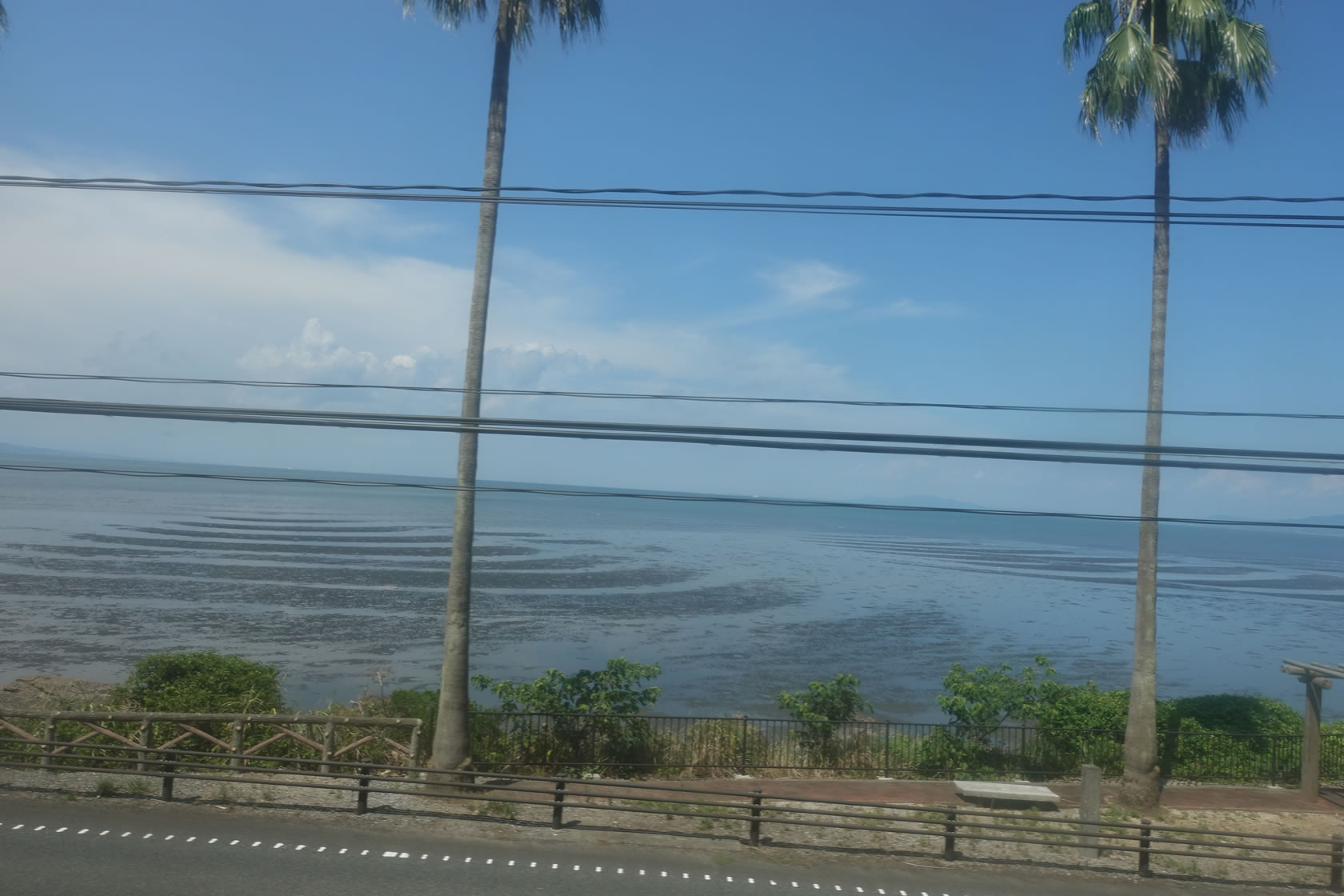 行きの「A列車で行こう1号」の道のりを逆に進むわけですが、有明海は干潮に向かっていたようで、先ほどは水で満たされた海岸線が干潟になっています。この大きな干満と遠浅の海が有明海の特徴でしょうか。