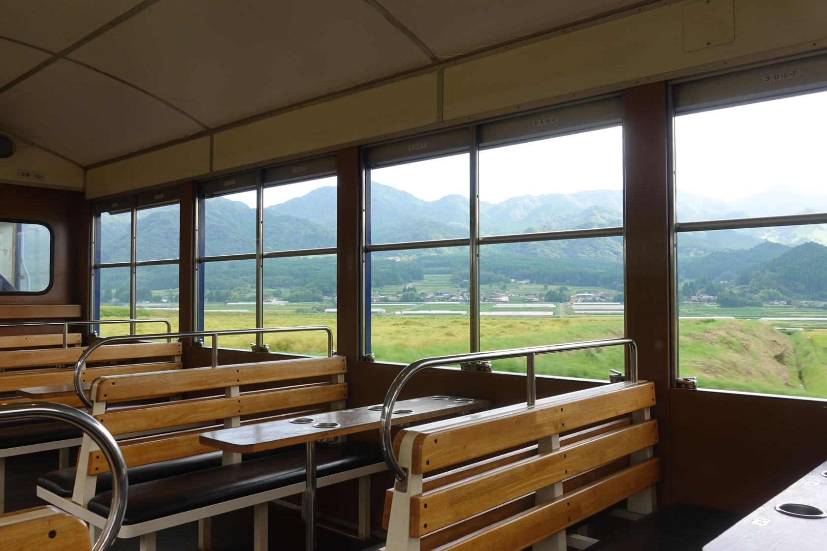 基本的に長陽~高森の間は阿蘇のカルデラ地帯を淡々と走ります。ただし、この日の1号車は私一人なので、こんなトロッコ越しの景色なんかも撮れたりします。