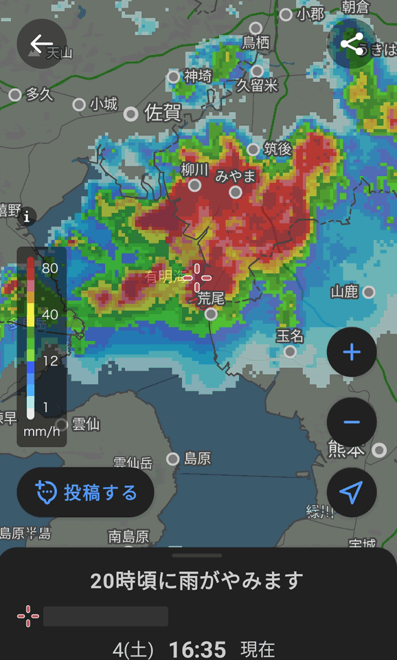 さっきまで晴れていた大牟田あたりが集中豪雨にあっているようです。さてどうしたものか。