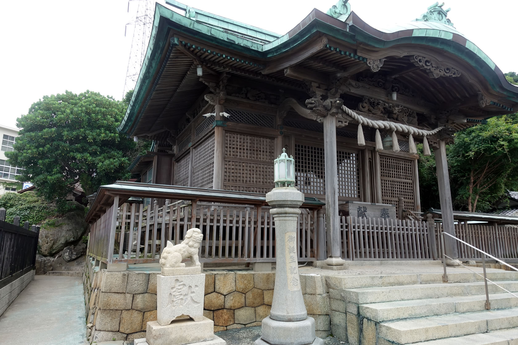 ここは海沿い、しかも関門海峡に面した神社です。境内はそこまで広くなく海岸沿いに沿って駐車場や会館、社務所、そして本殿があります。