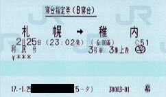 「稚内->札幌」自由席特急券/特急「スーパー北斗2号」特急券